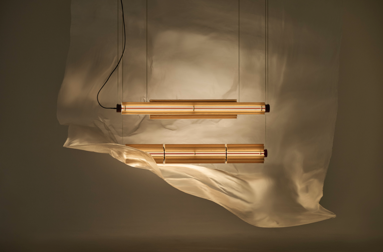 我們發現複數的陣列感,是一種東亞文化中唾手可得的熟悉感,從水車,茶刷,書簡,竹簾,扇子,到成形燈籠的第一層骨架。繁複卻幾何陣列的樣貌,在線條上反覆並持續勾勒著,如「糖蔥」般的長型燈具便誕生了。