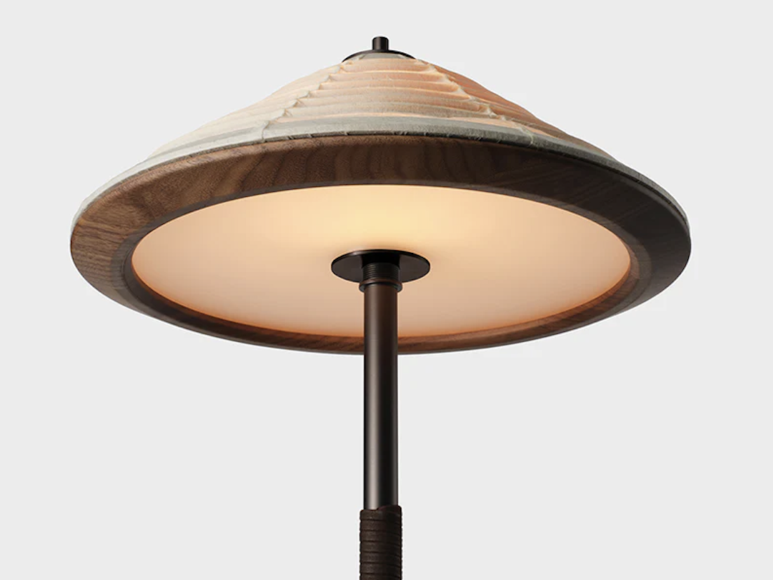 The N-TL01 Table Lamp blends Japanese design excellence with tradition, featuring a bronzed steel base wrapped in leather, a washi paper shade by Kyoto’s Kojima Shoten, and a warm wooden ring by Karimoku Case—echoing the N-TL01’s refined style.